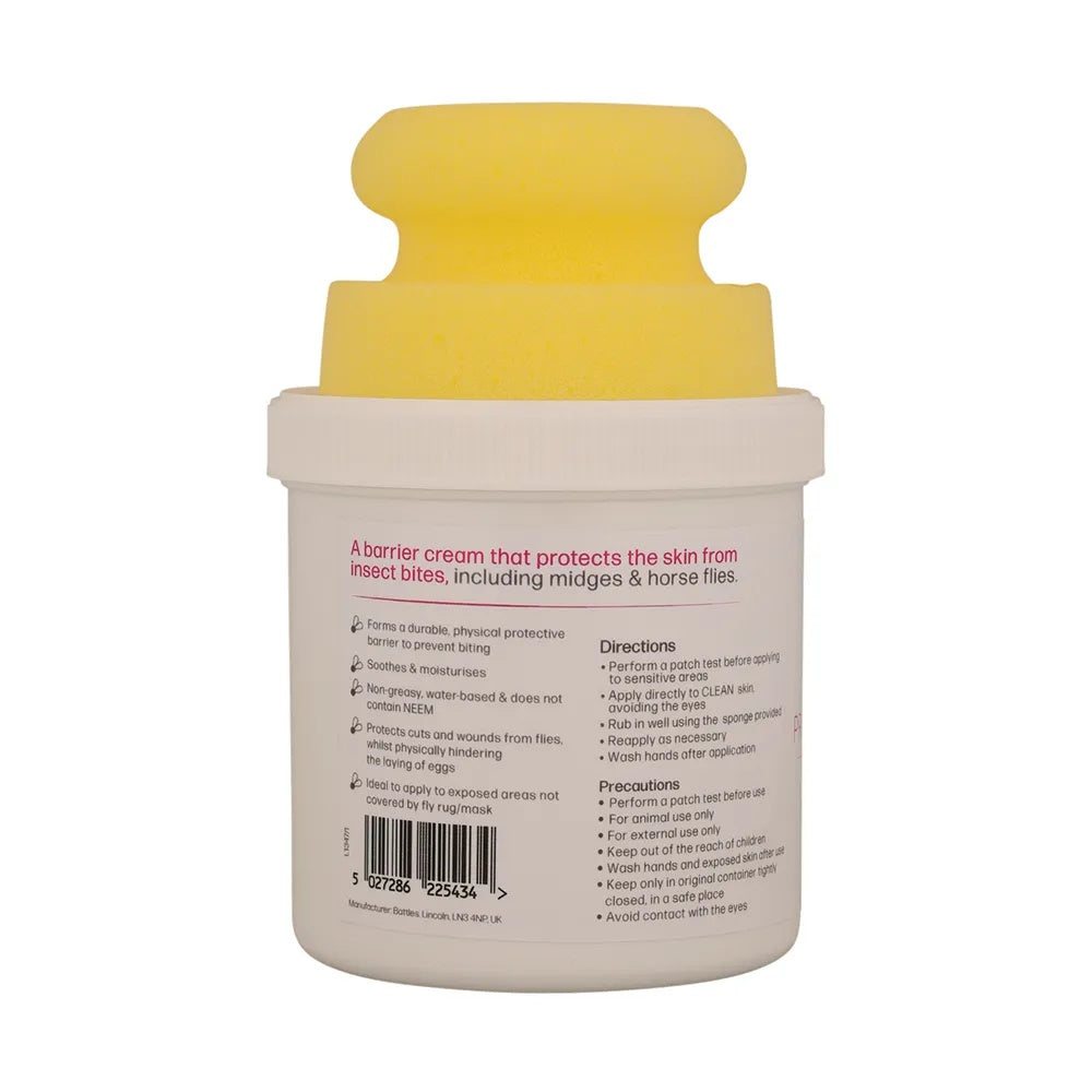 A barrier cream which protects the skin from insect bites, including midges and horse flies. Forms a durable, physical protective barrier to prevent biting whilst soothing and moisturising. This non-greasy, water-based and does not contain NEEM and protects cuts and wounds from flies, whilst physically hindering the laying of eggs. Ideal to apply to exposed areas not covered by fly rug/mask. Comes with FREE Circular Sponge.