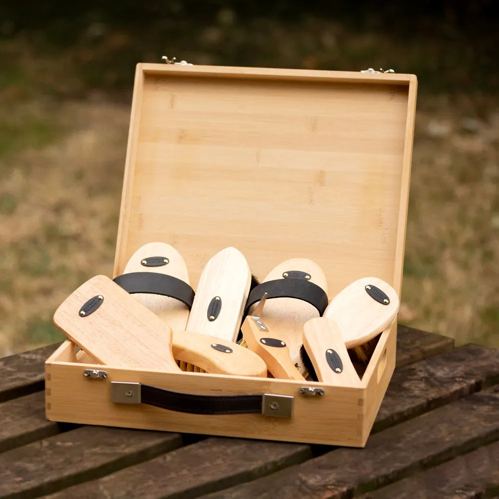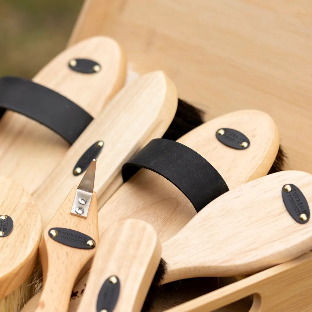 The ultimate luxurious grooming box and brush set. An ideal gift, this beautiful wooden box features exquisite gold hardware, a leather handle for easy carrying, and is engraved with the three signature Supreme horses. The box contains the full set of gleaming brushes to ensure your horse is kept looking its best. Brushes included are: gleaming coat body brush, dandy brush, flicker brush, finishing brush, face brush, hoof & bucket brush, hoof pick, and mane & tail comb.